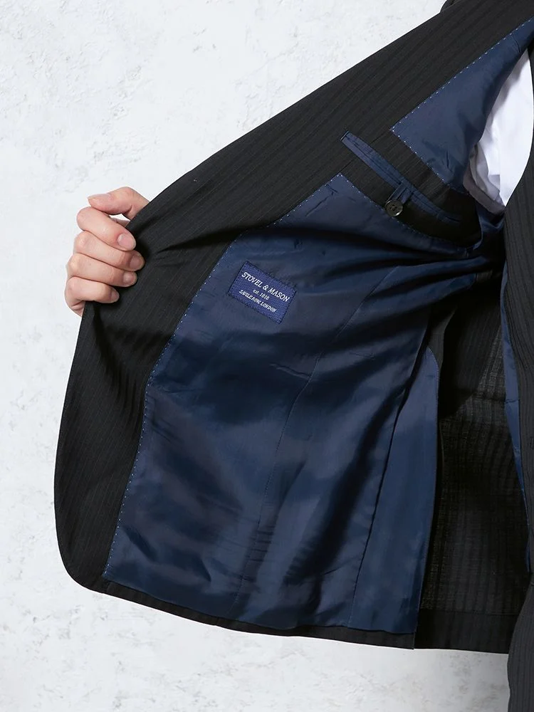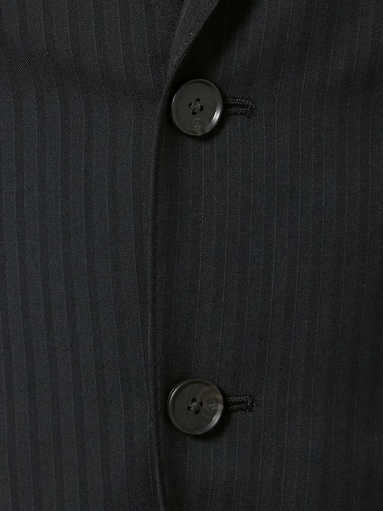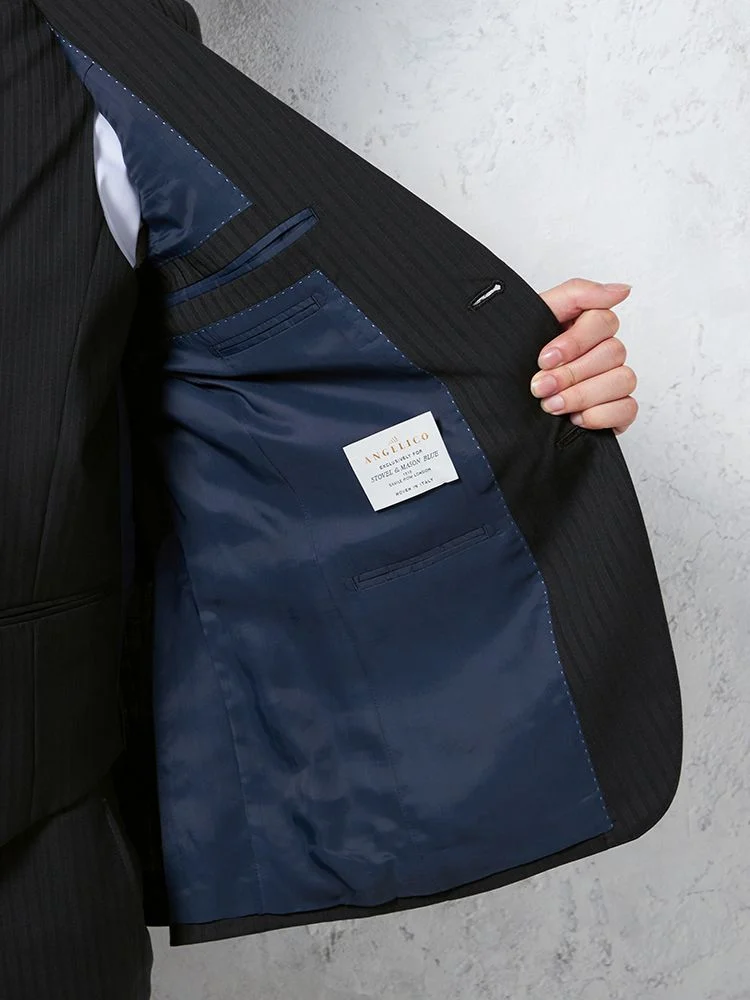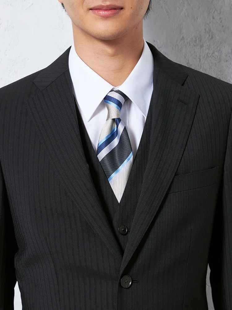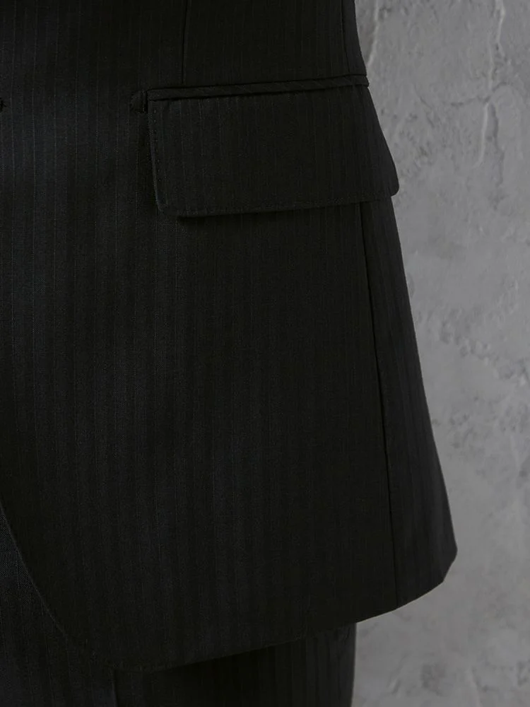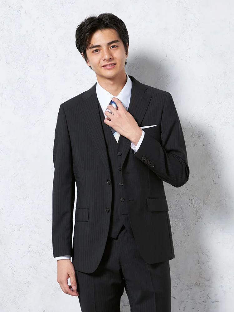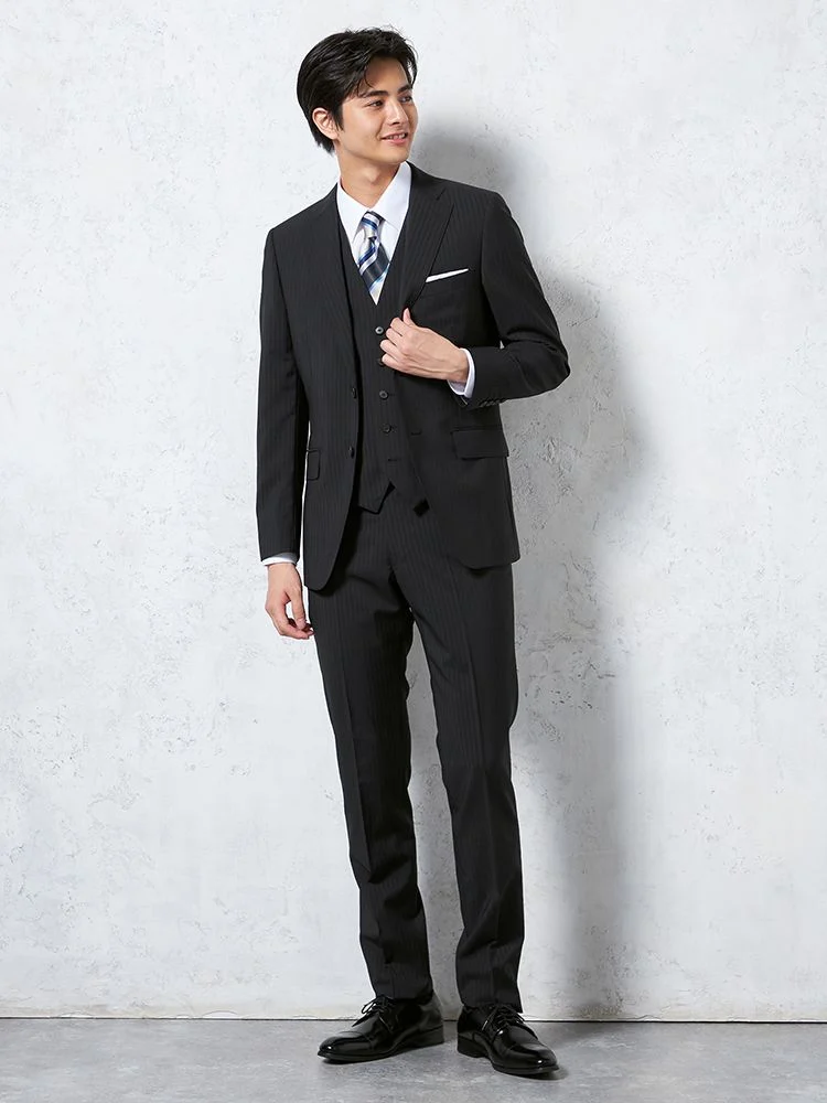 洗練されたな着こなしに仕上がるブラック×ストライプのスリーピーススーツ。
