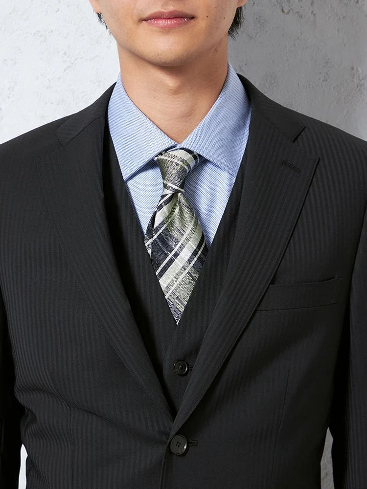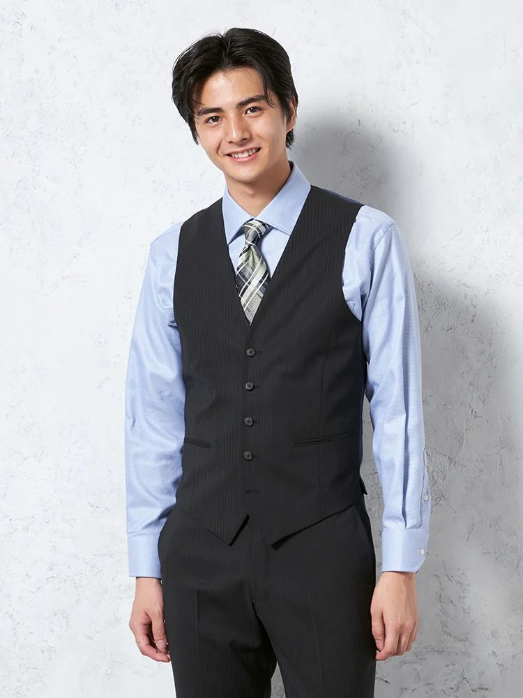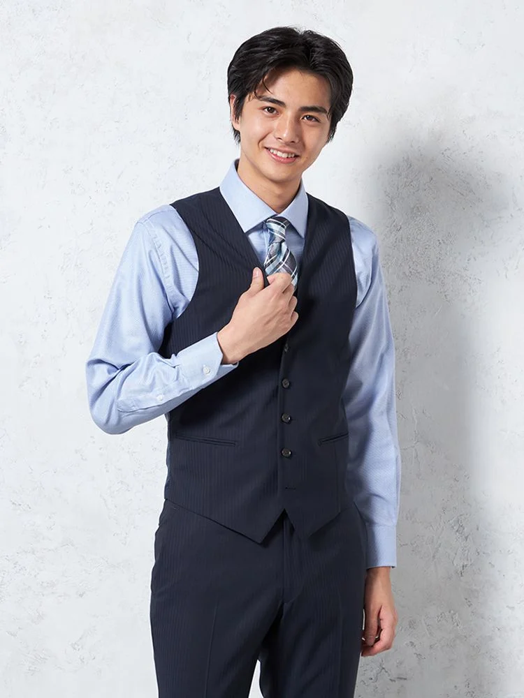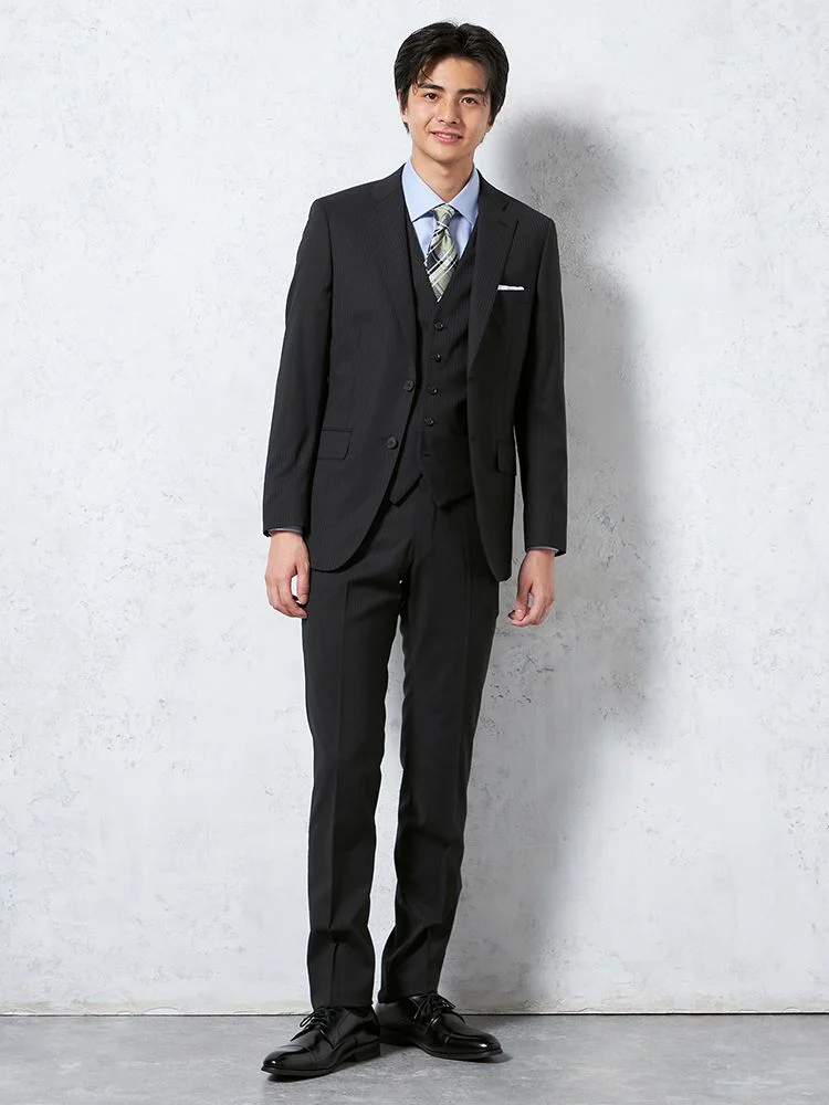 ジャケット、パンツ、ベストの3点セットで、スーツ全体を簡単にコーディネートできます。ビジネスやフォーマルな場面に最適です。