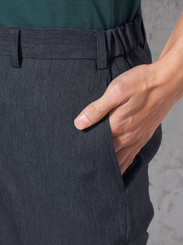 パンツの腰回りに生地の折り込みがなく、スッキリとしたシルエットを実現します。シンプルで洗練された印象を与え、すっきりとした着こなしが可能です。