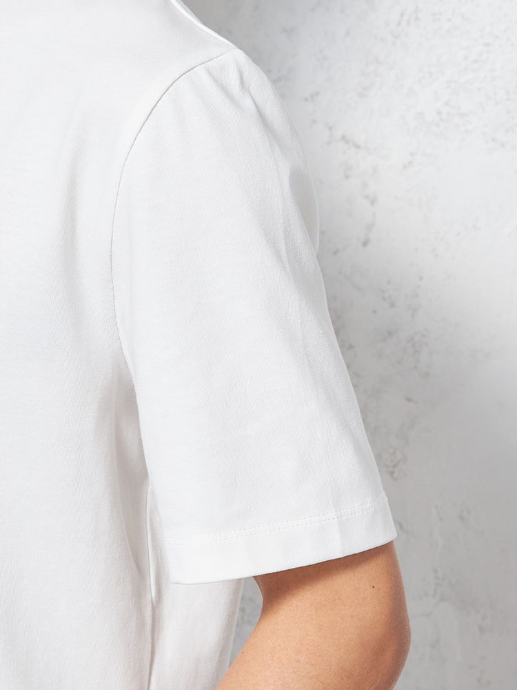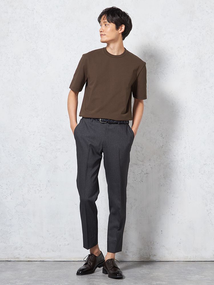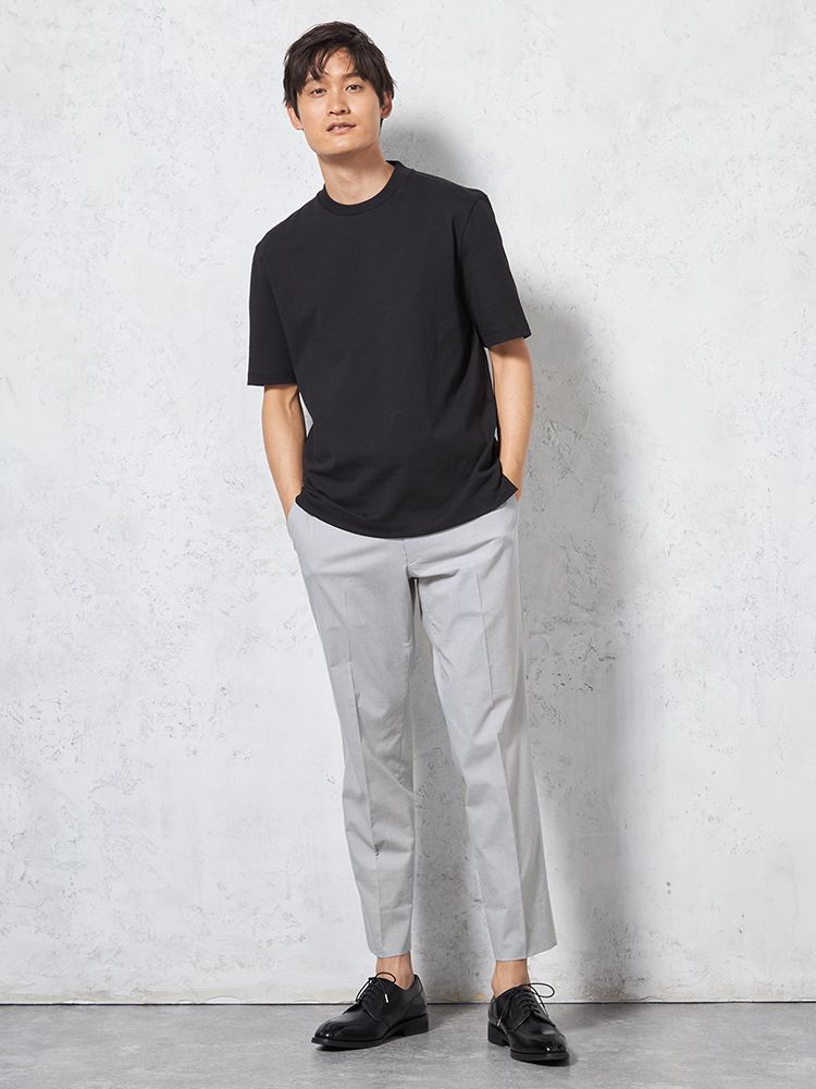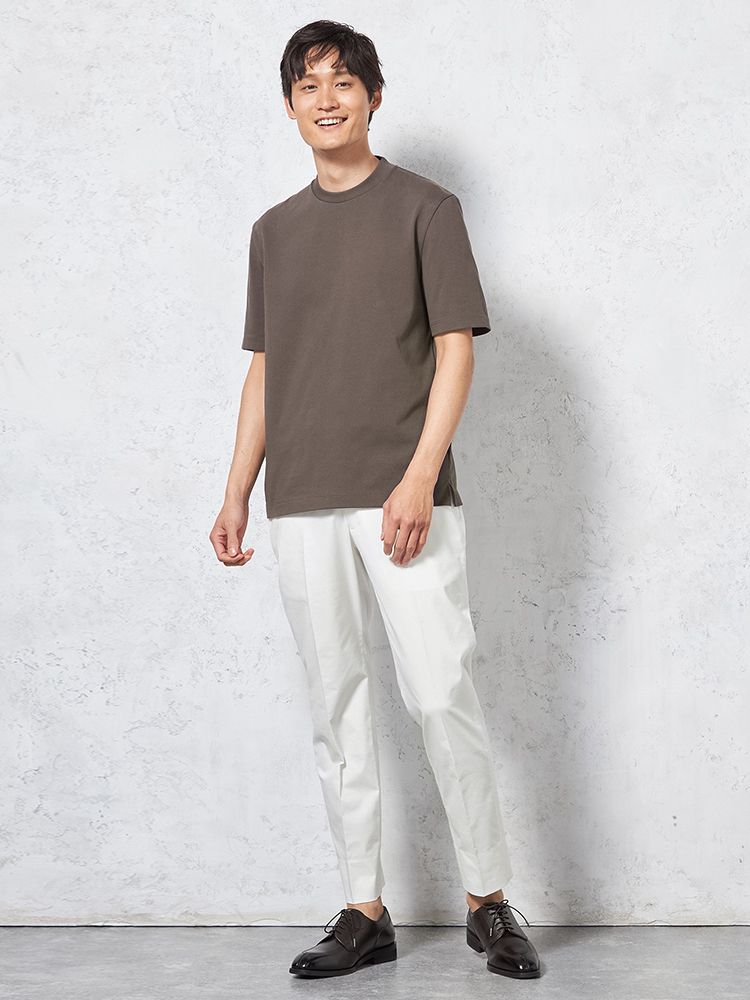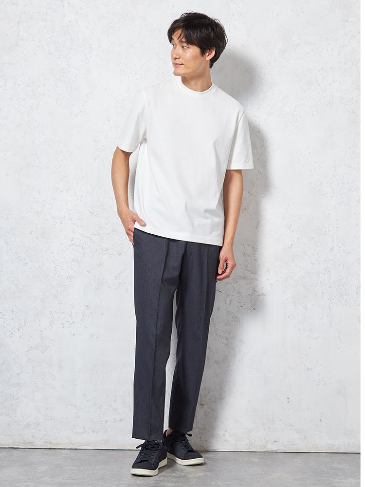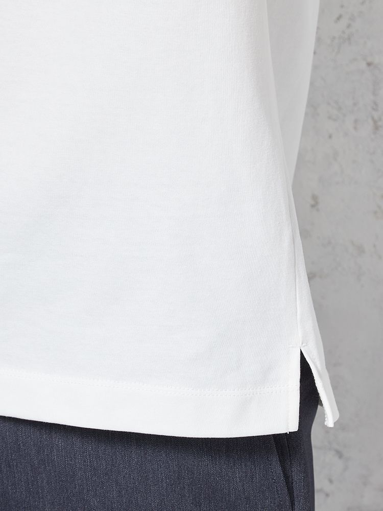汗じみ防止加工と、後ろ衿高仕様でジャケットインナーとしても使い勝手抜群。