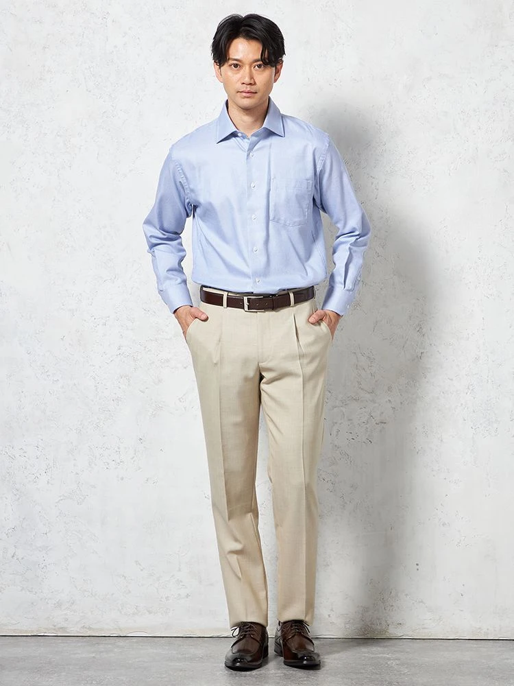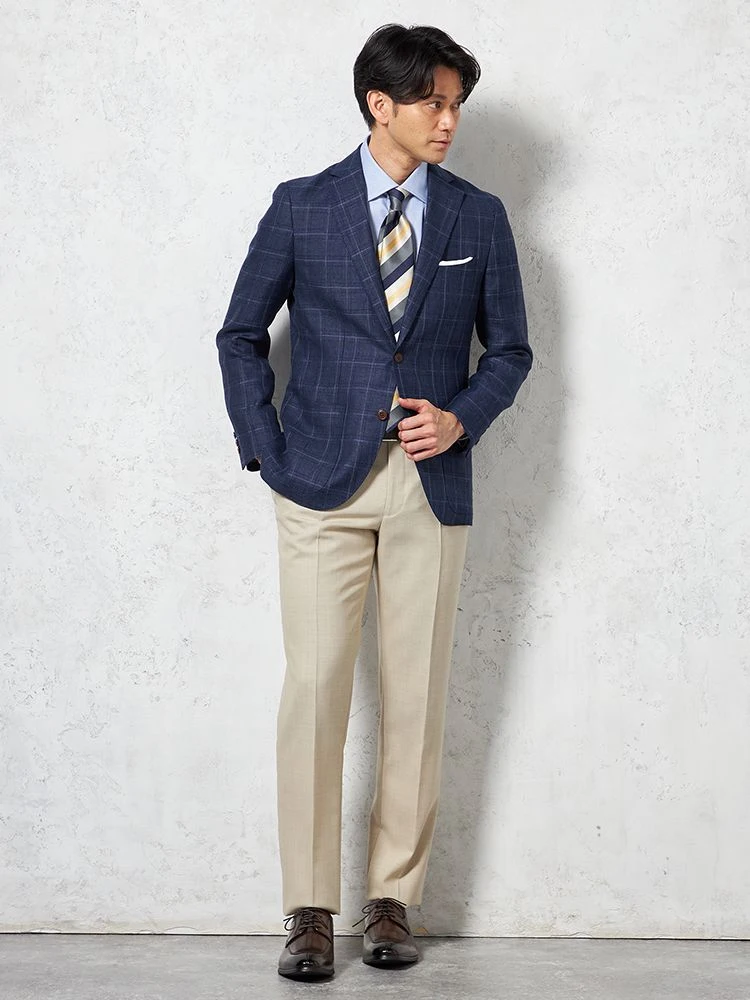 細身すぎず、太すぎない程良いシルエットで好印象を誘うスーツスタイルを演出。