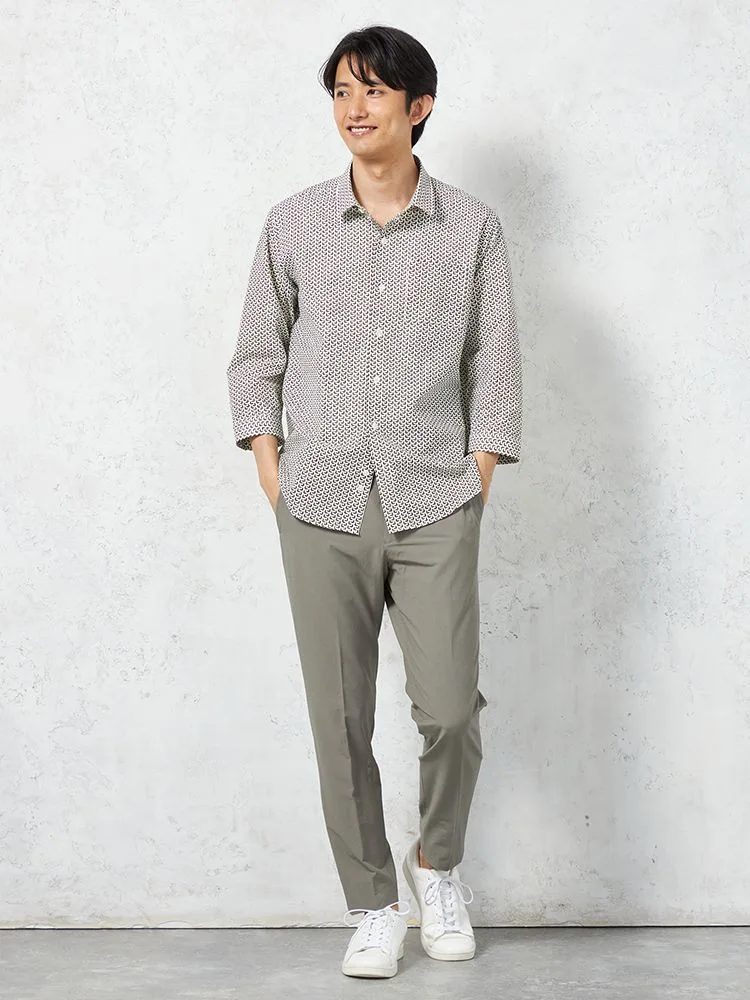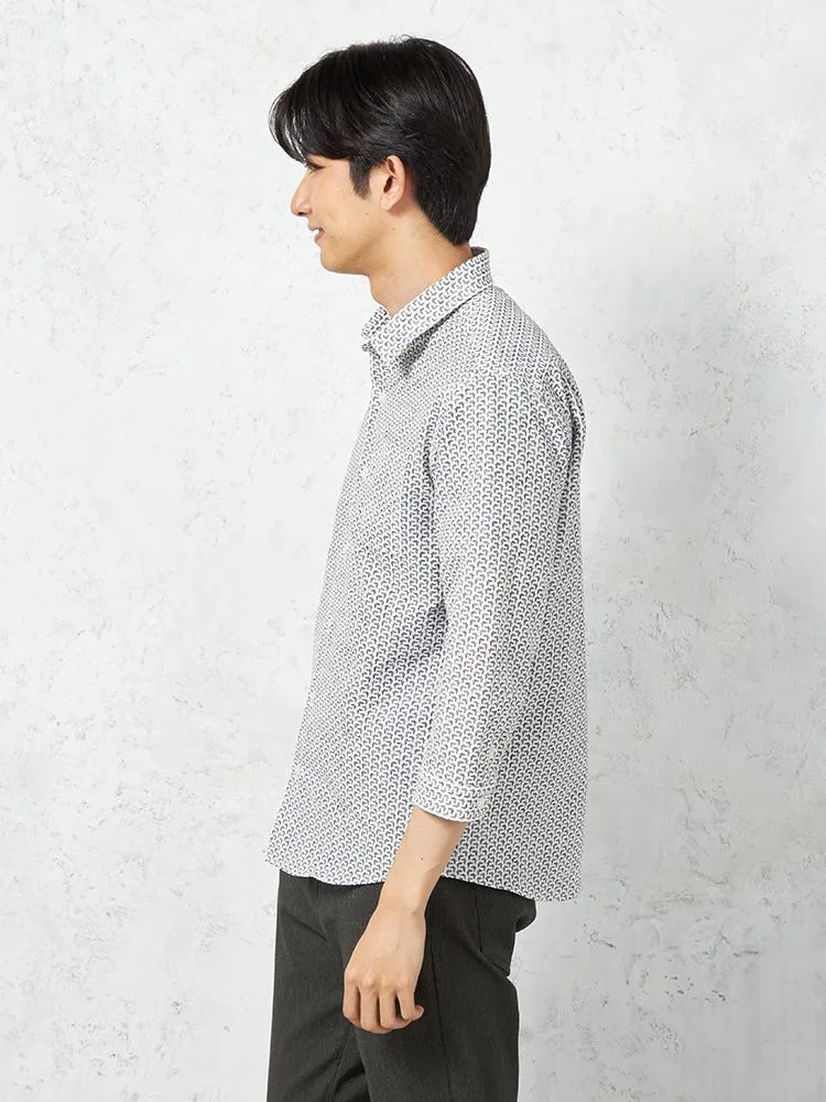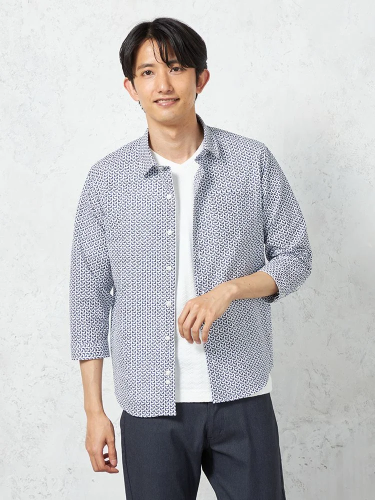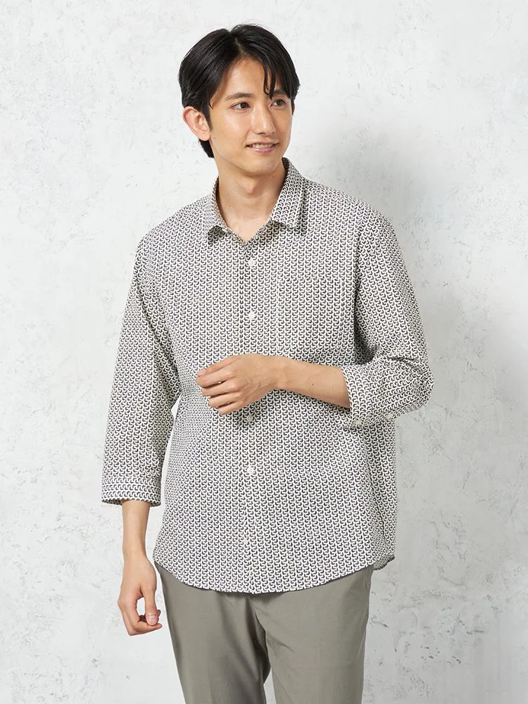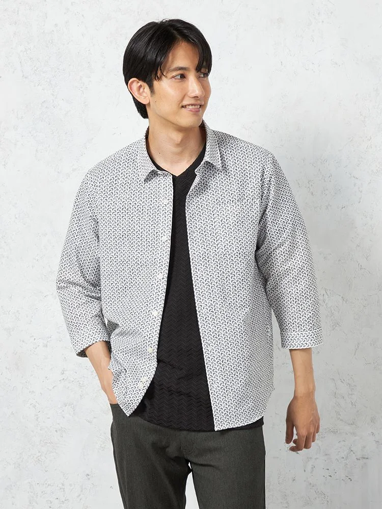 凹凸のある素材の上からプリントを重ねた、総柄の七分袖シャツ。