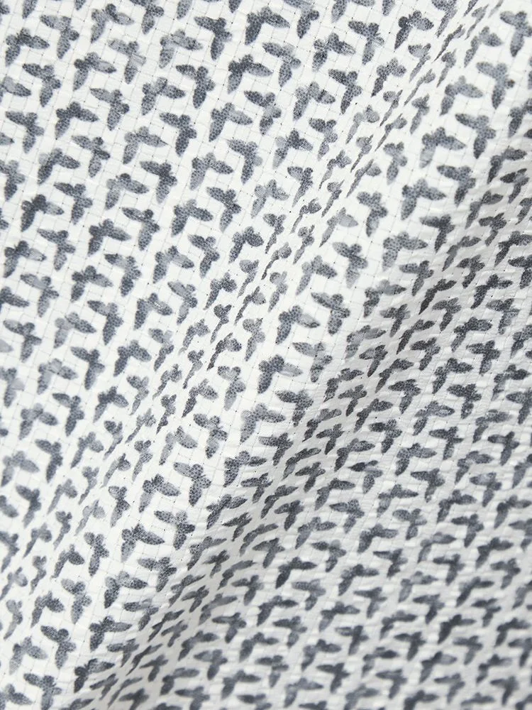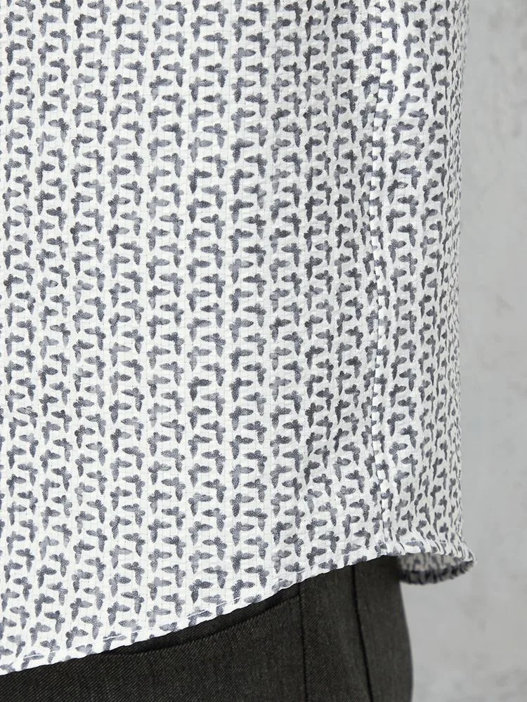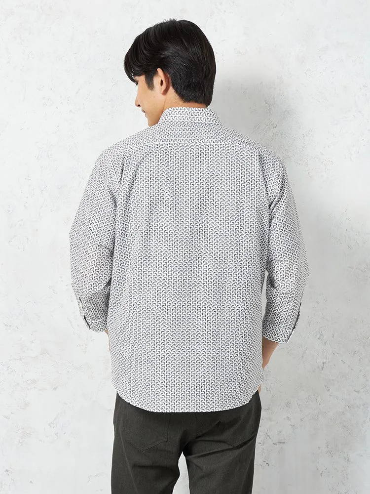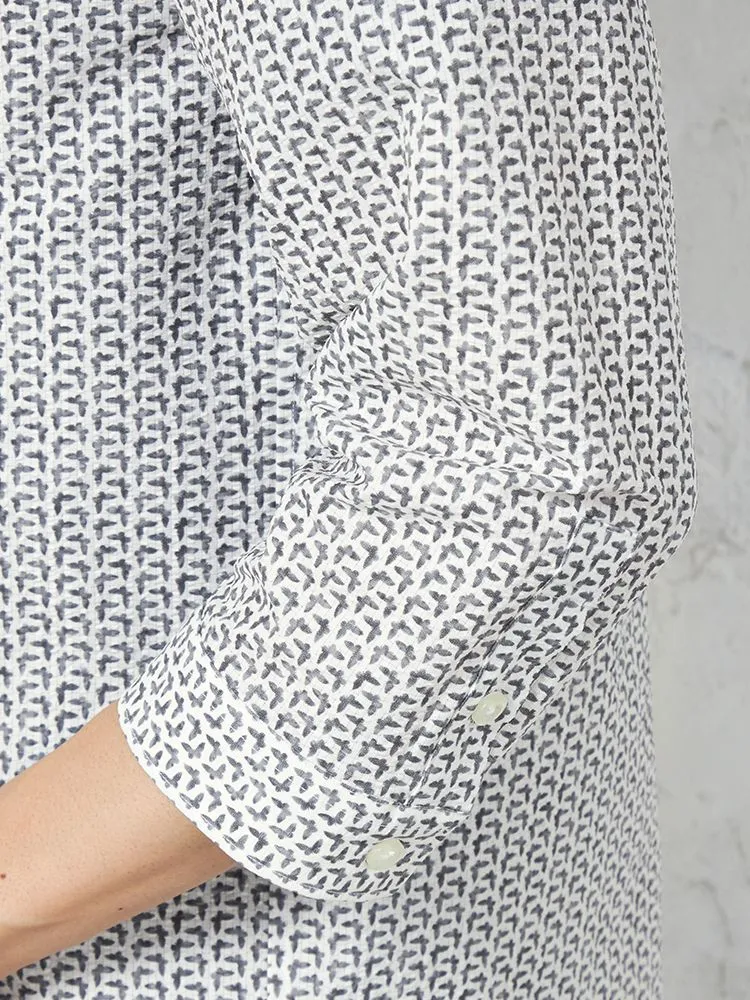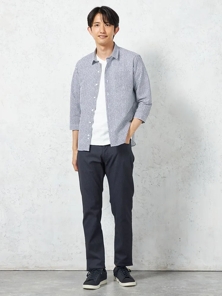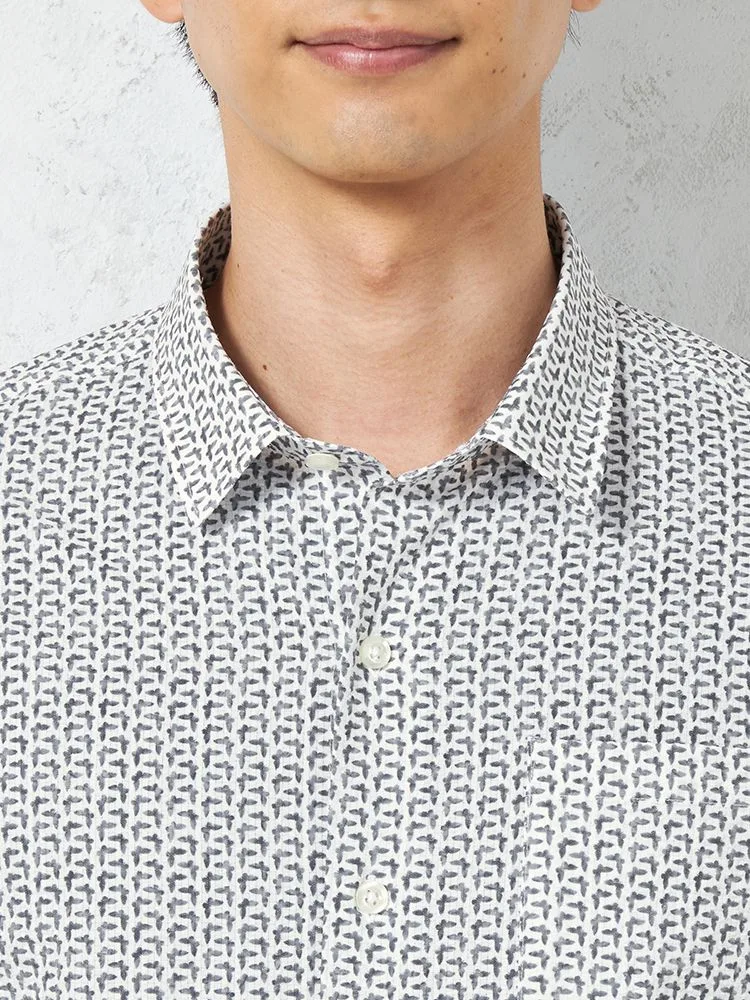 凹凸のある素材の上からプリントを重ねた、総柄の七分袖シャツ。