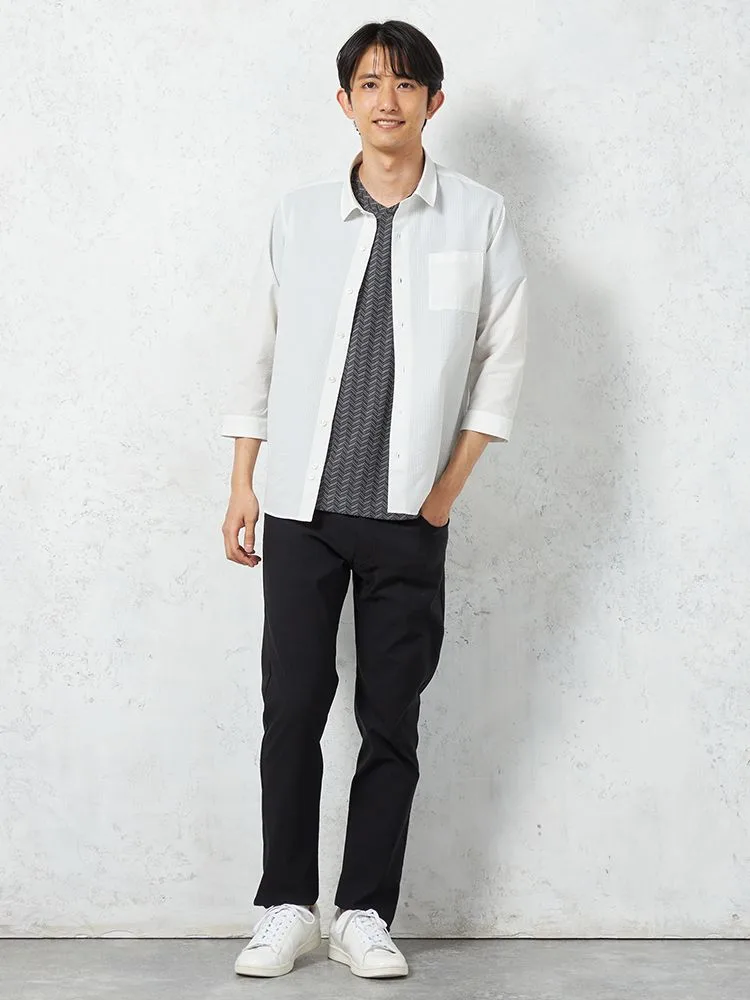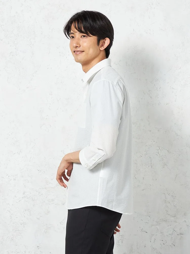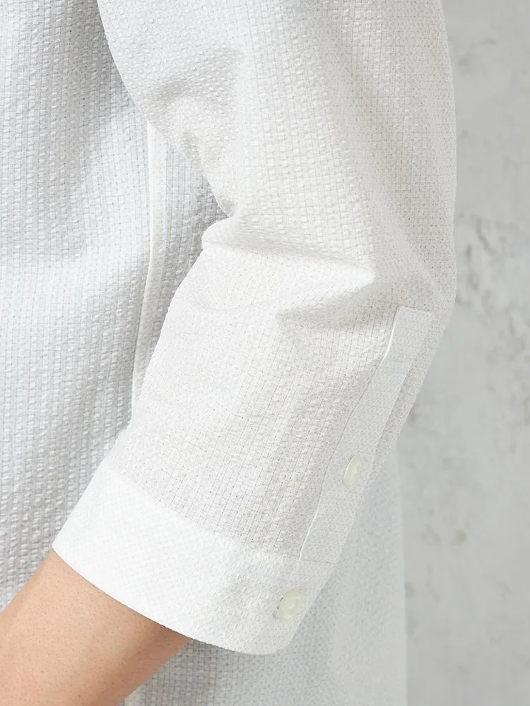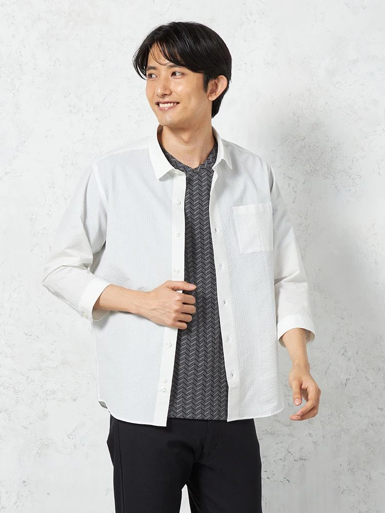 凹凸のある独特の素材感が特徴的な七分袖シャツ。