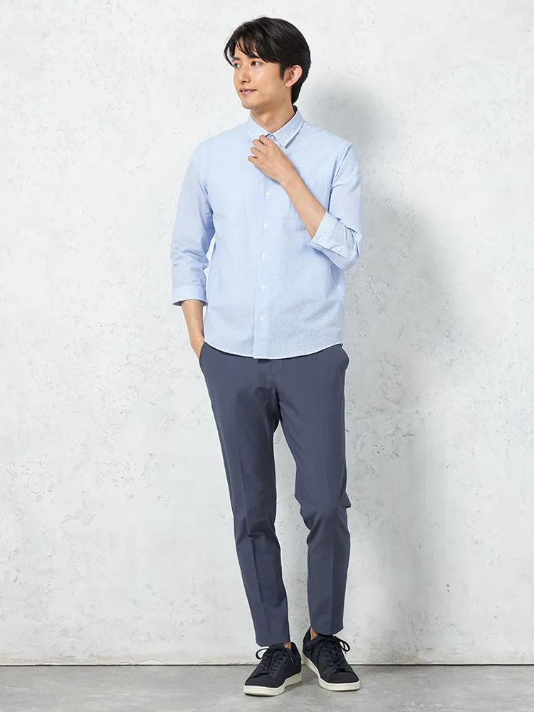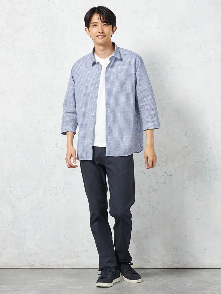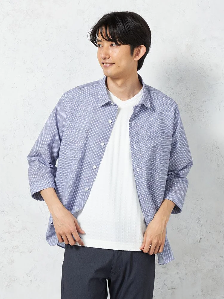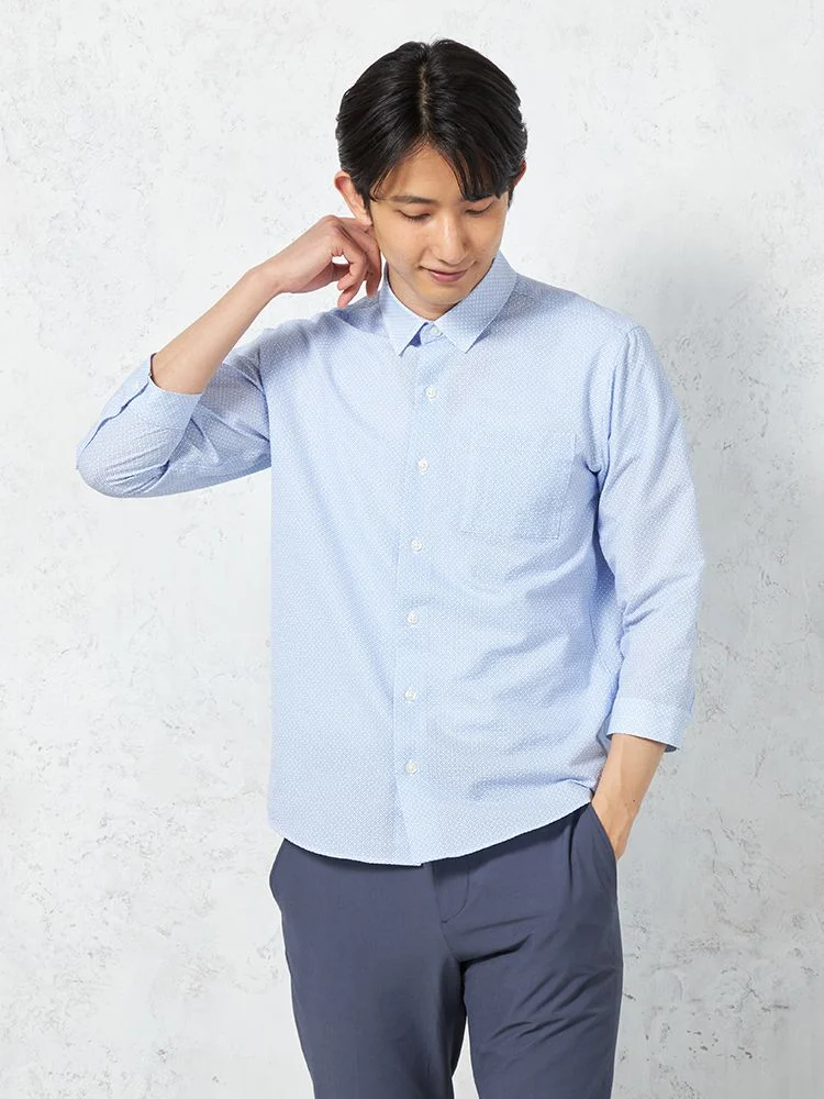 【RUCKEN BACCHAR】7分袖 レギュラーカラー プリントシャツ ミニ小紋柄 カジュアルインナー 春夏(サックス)