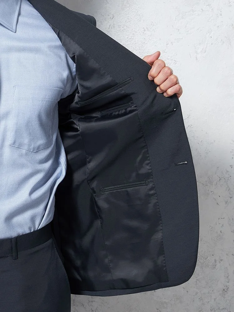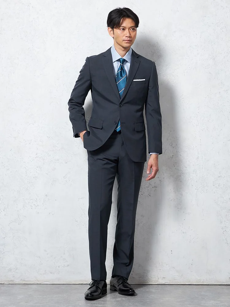 通年着用できるクリーンなネイビーのツーピーススーツ。