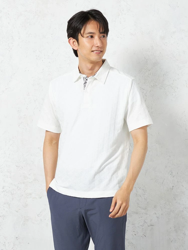 【RUCKEN BACCHAR】半袖 ポロシャツ 衿裏配色 幾何学ジャガード カジュアルインナー 春夏(ホワイト)