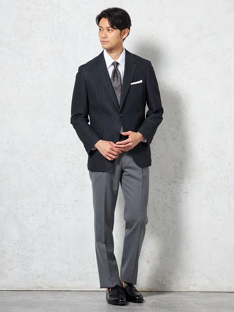 切り込みが1本のセンターベントデザインです。細身でスッキリとしたシルエットが特徴で、快適な着心地を提供します