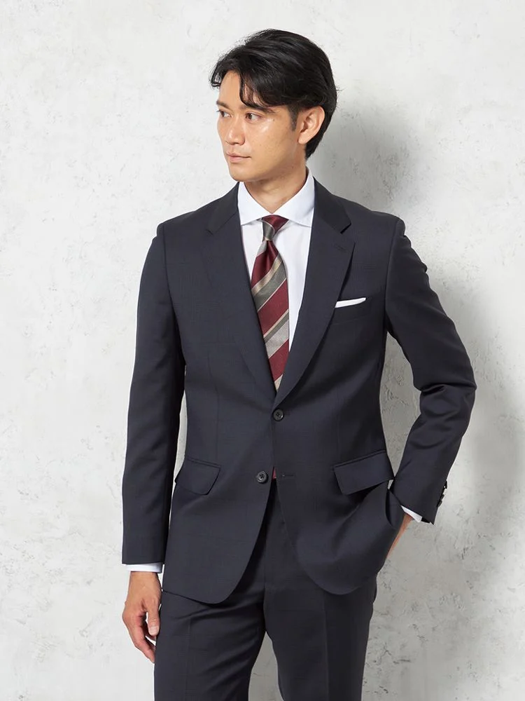 【ウール混】スーツ2つボタンイタリア製生地ネイビーチェックリッケンバッカーホワイト