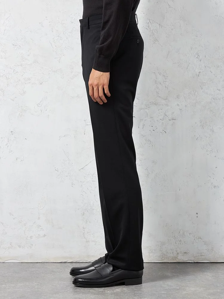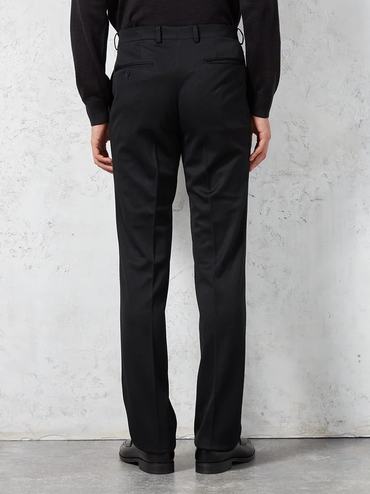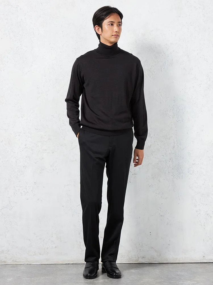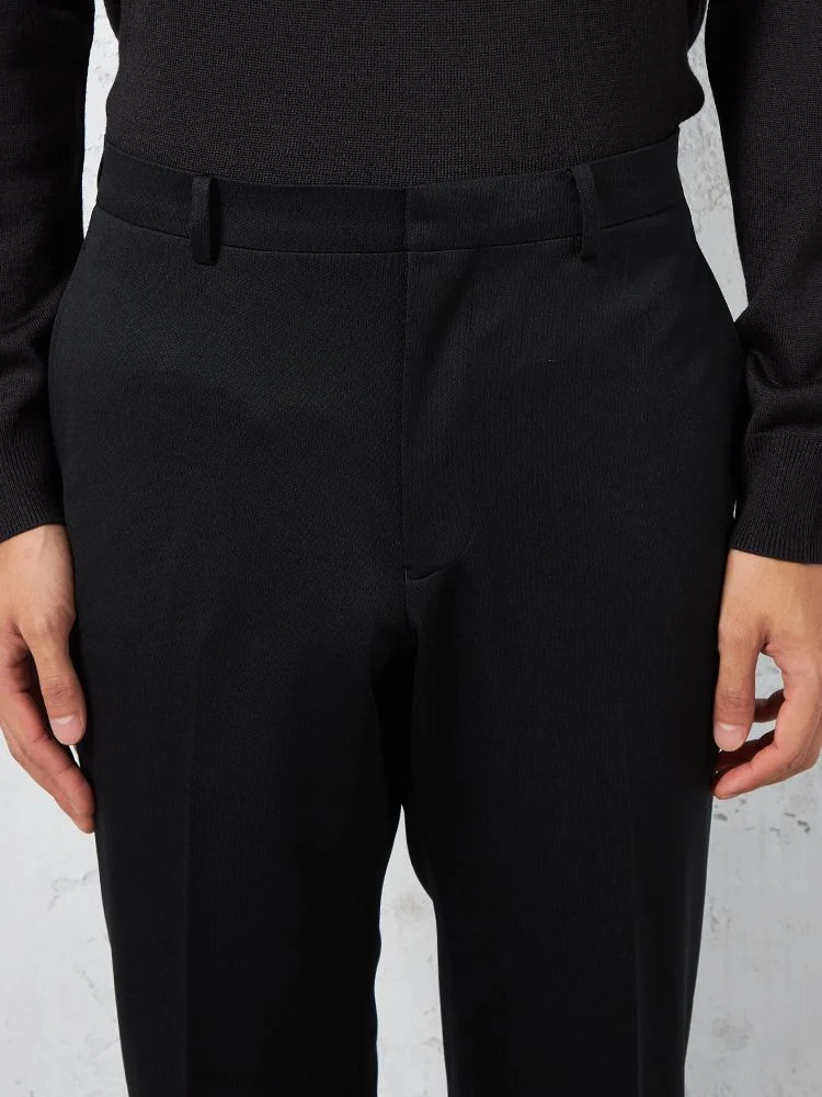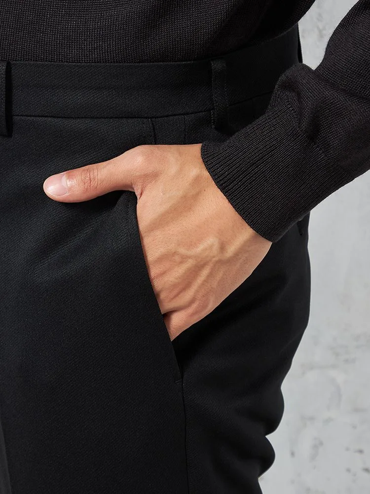 ビジネスからフォーマルまで、着用シーンを選ばないシンプルなブラック×無地のスラックス。