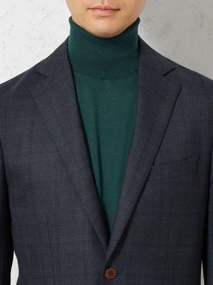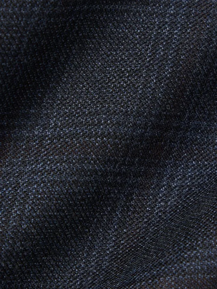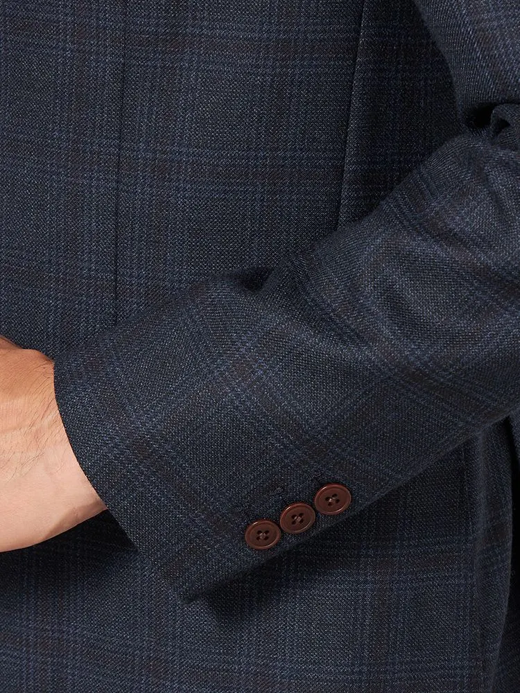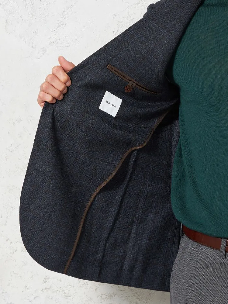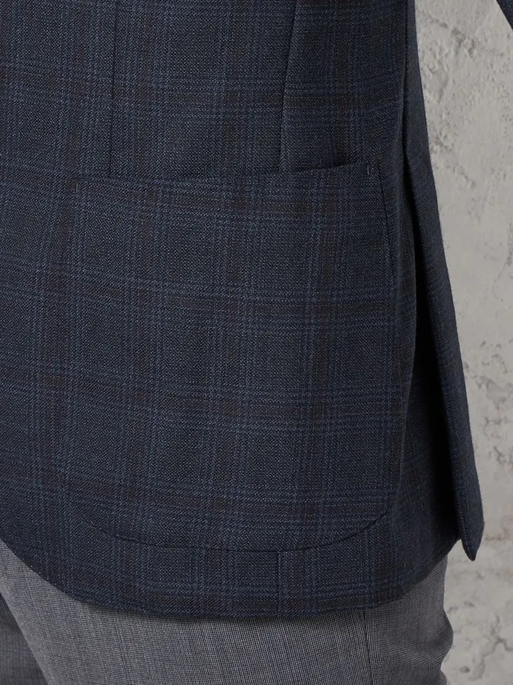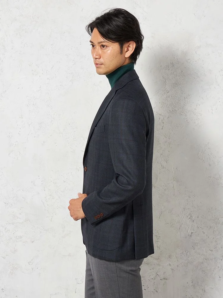 トラッドなチェック柄2つボタンデザインに高品質で艶のある複雑な色合いが魅力。
