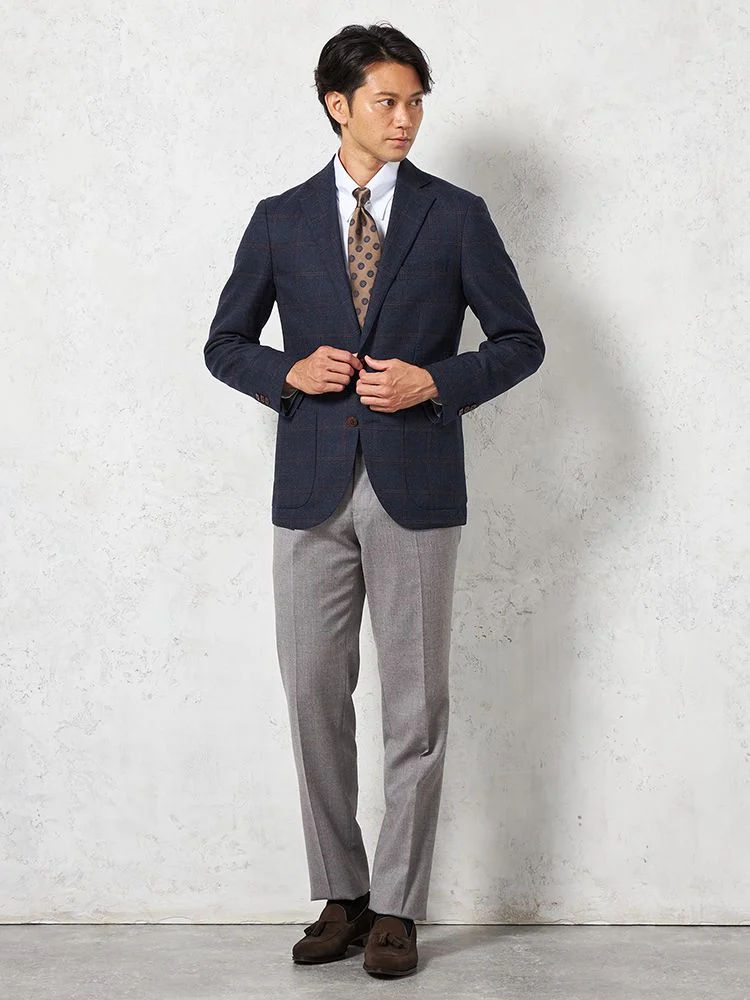 2つボタンのデザインで、クラシックなスタイルを演出。落ち着きと品のあるアイテムです。