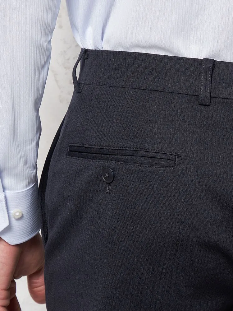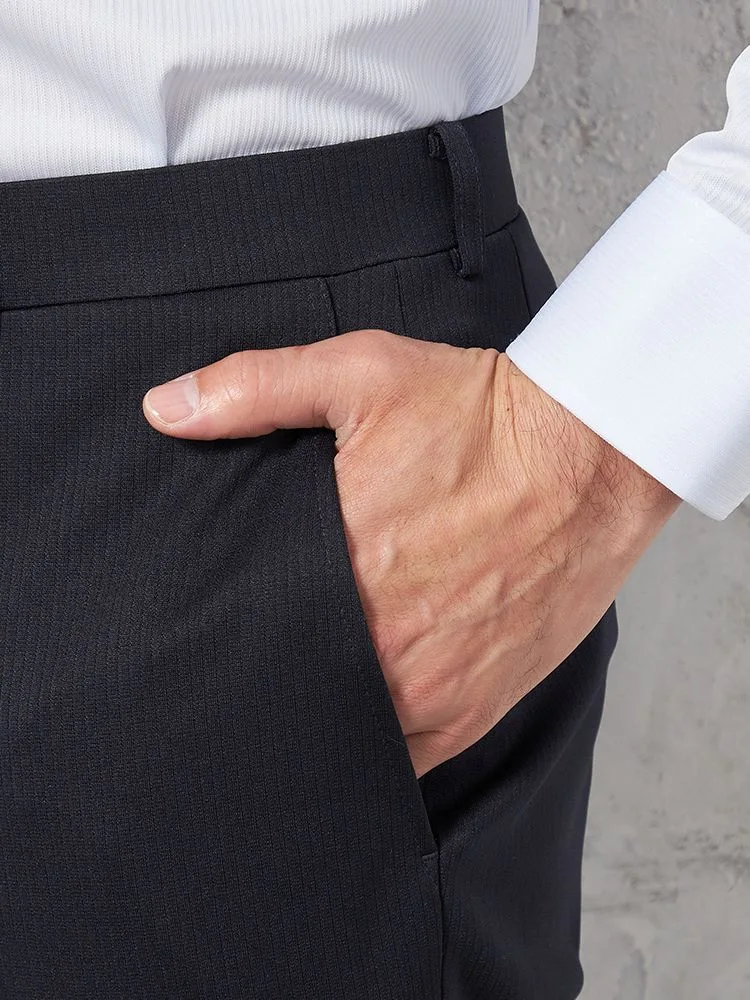 パンツの腰回りに生地の折り込みがなく、スッキリとしたシルエットを実現します。シンプルで洗練された印象を与え、すっきりとした着こなしが可能です。