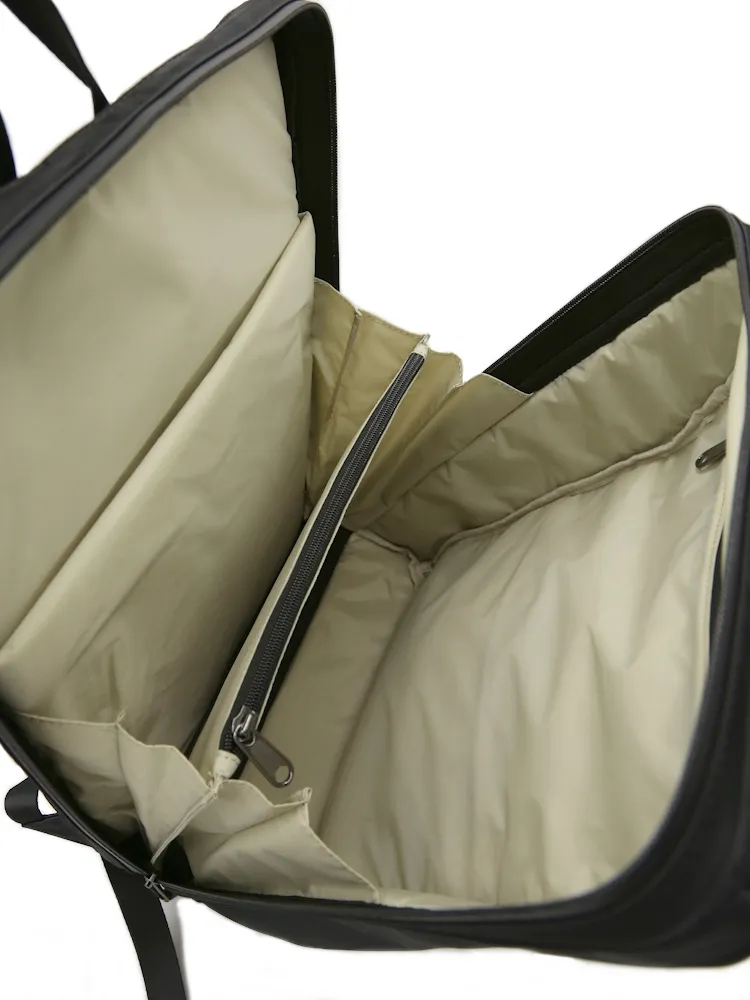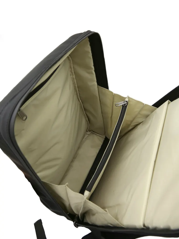 リュックの開閉口に特殊なパーツを使用しているので、口が簡単に大きく開く構造になっています(実用新案登録済み)。本体に撥水加工素材、ファスナーにYKK止水ファスナーを使用しているので、雨や水に強い仕様となっています。通勤リュックからプライベートまで、長くご愛用いただける一品です。
