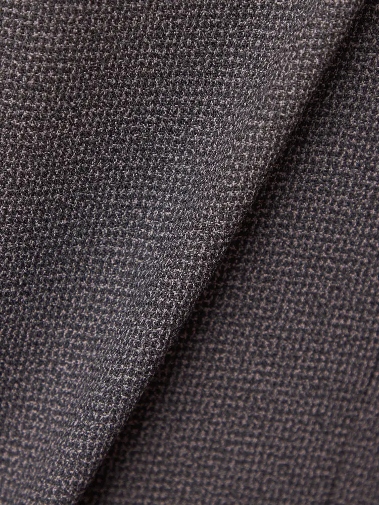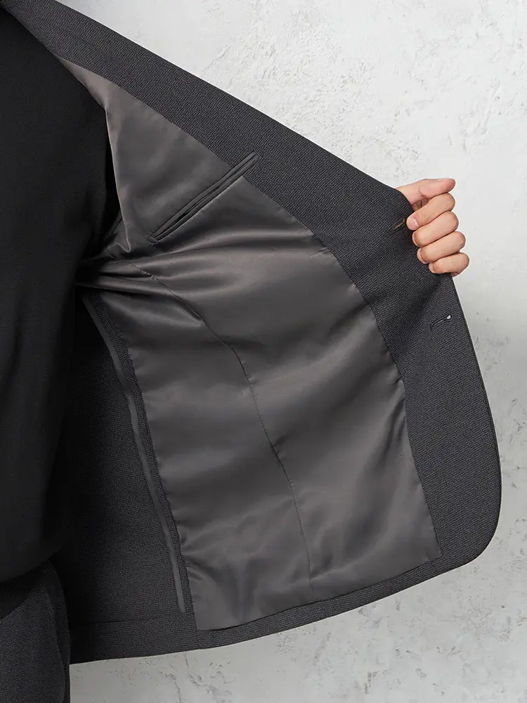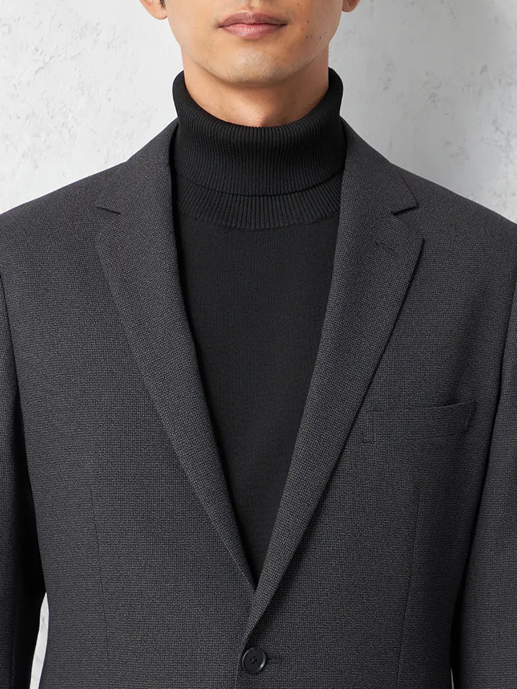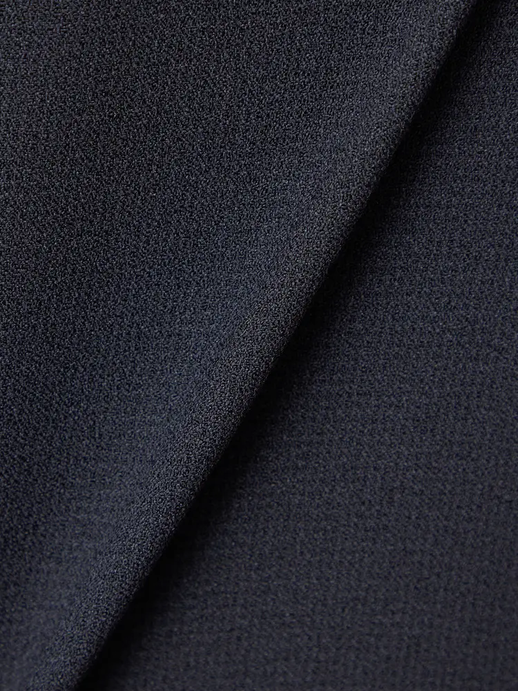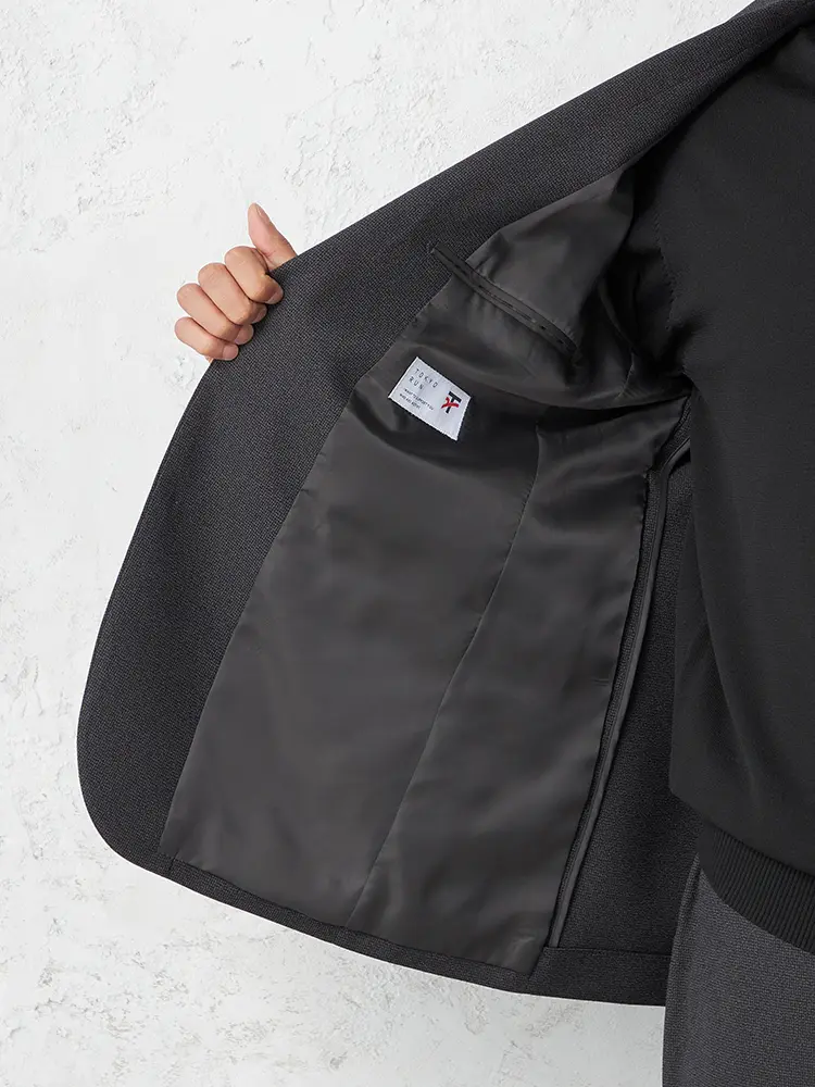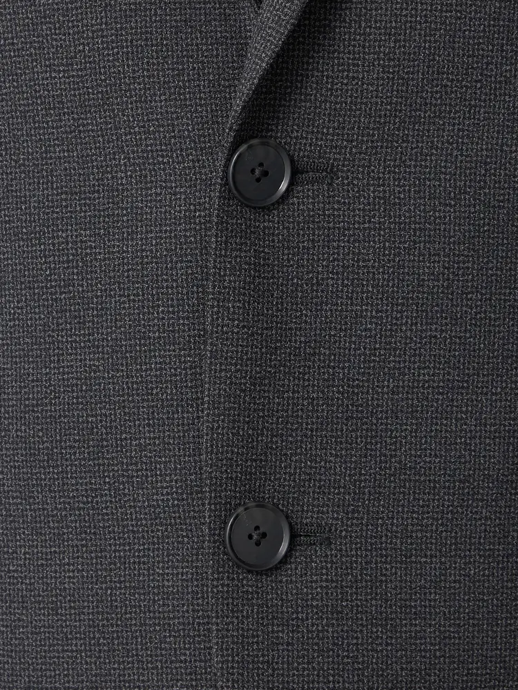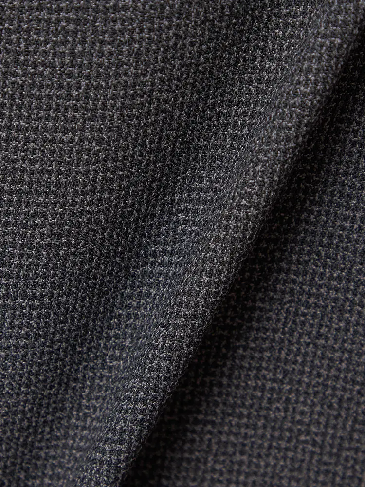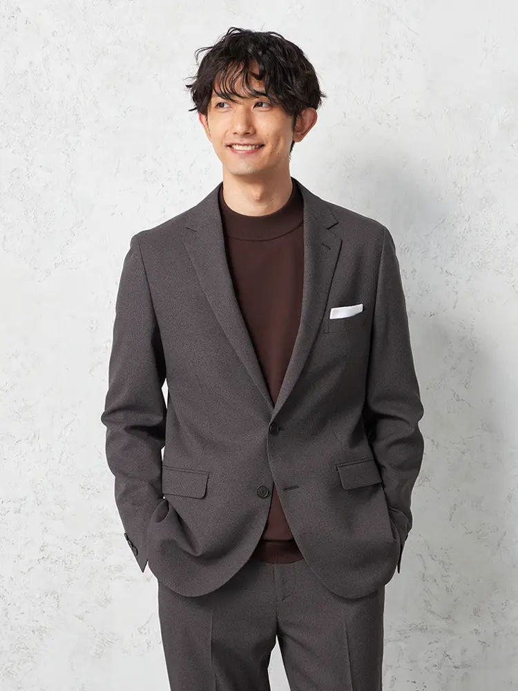 丈夫でしわになりにくいポリエステル100%素材使用しながら、ウールの様な質感とストレッチの効いた快適な着心地を両立。