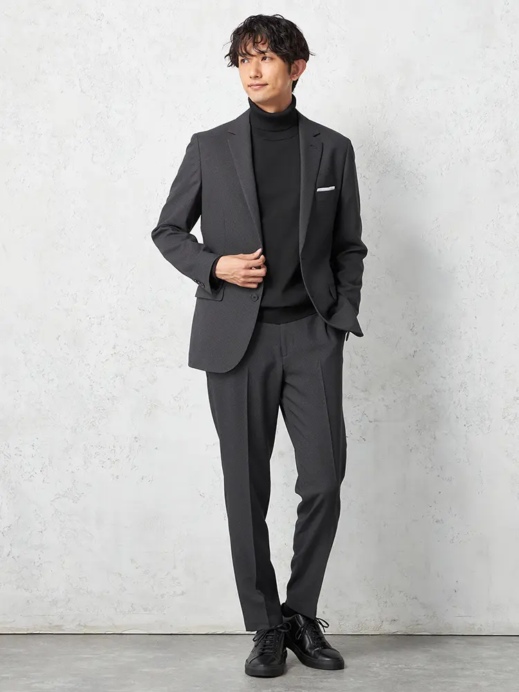 高めのゴージラインがトレンド感をさりげなく効かせます。