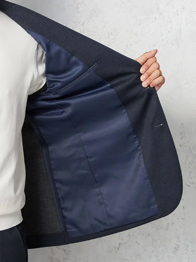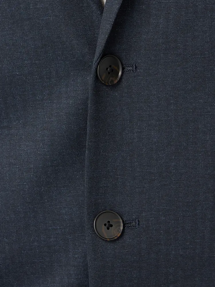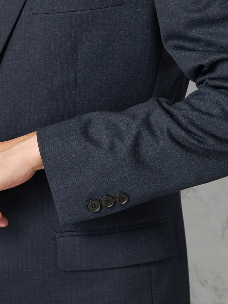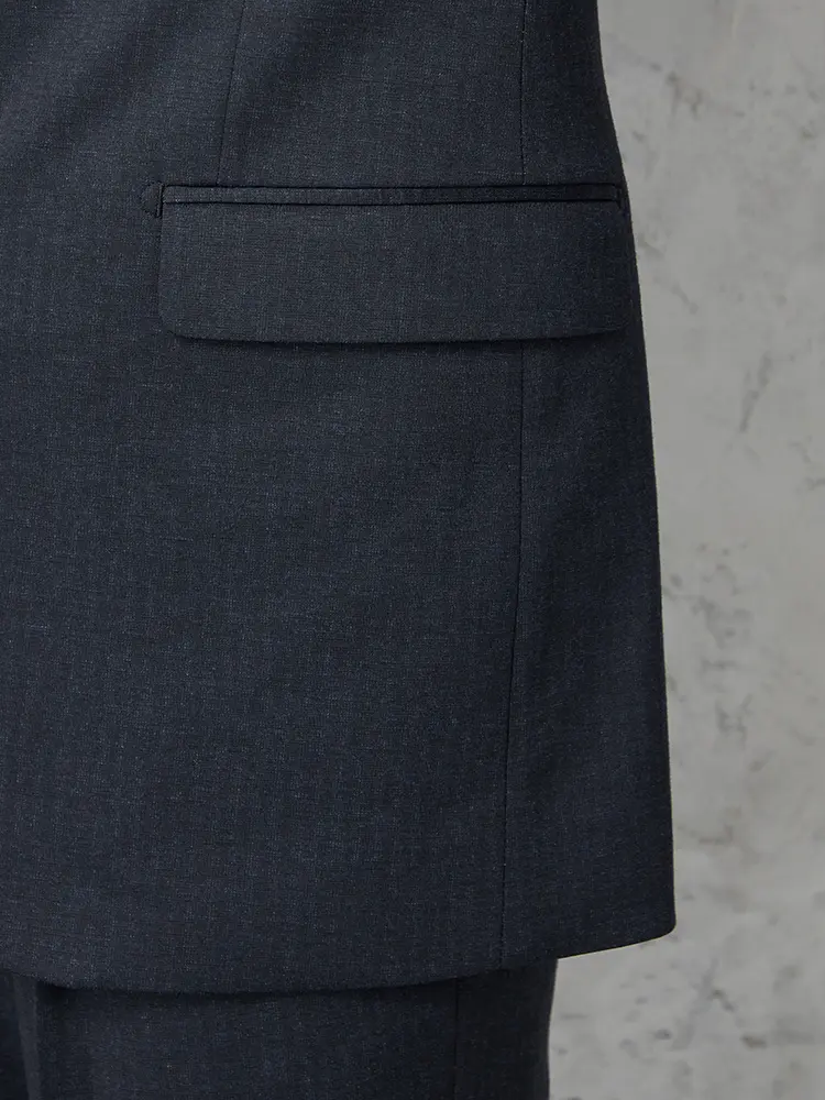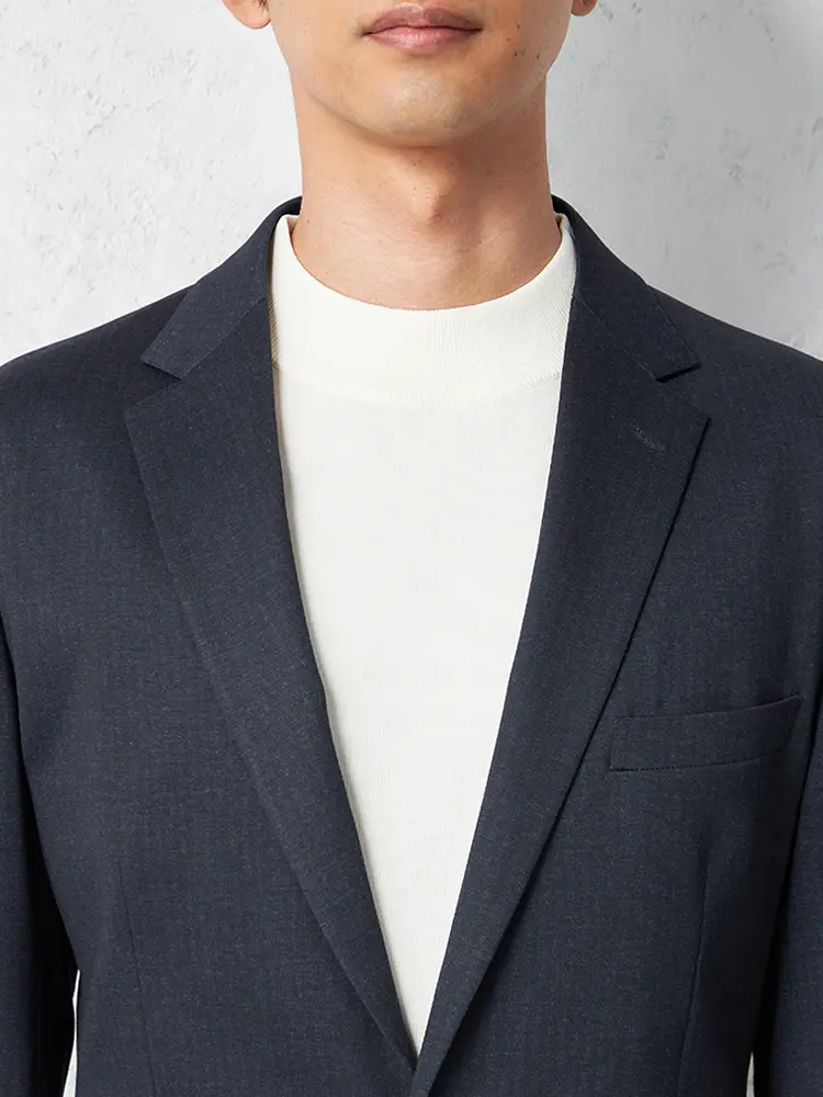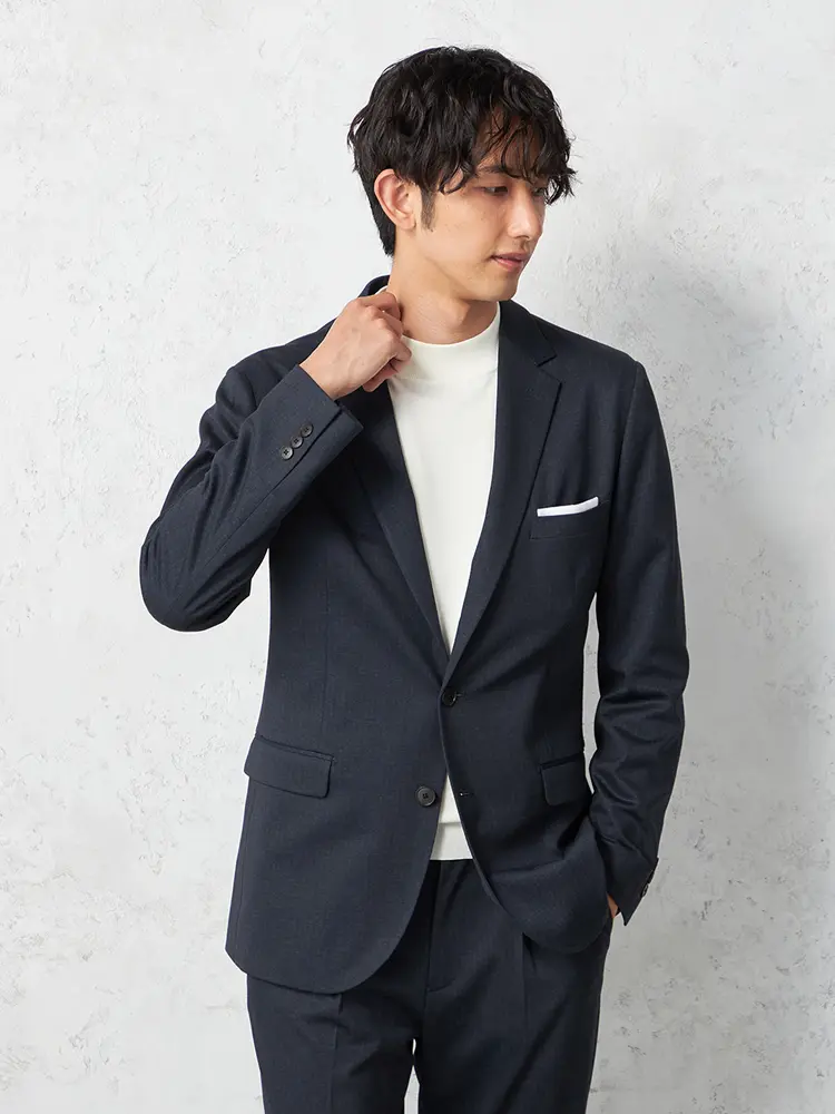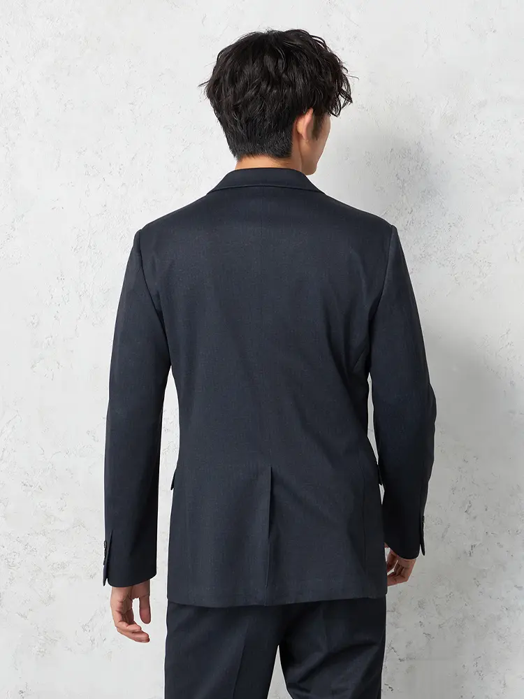ノッチドラペル、センターベント、背抜き仕様のシンプルでクラシカルなデザインのシングルジャケット。