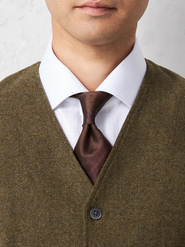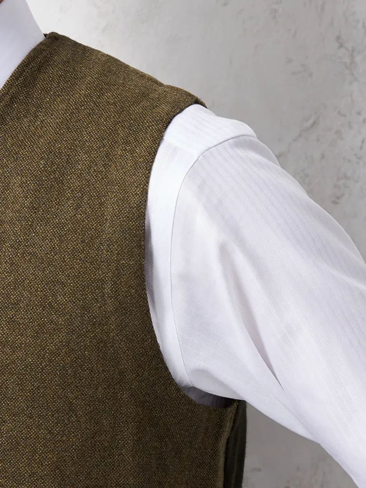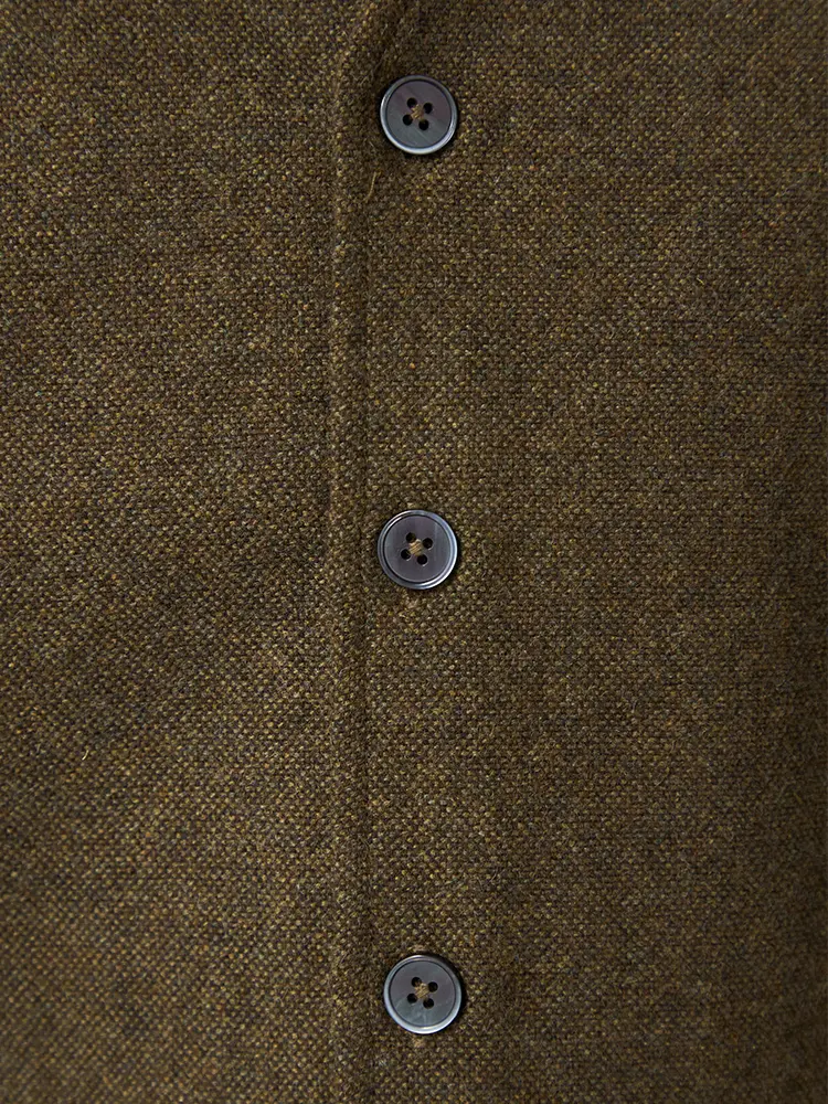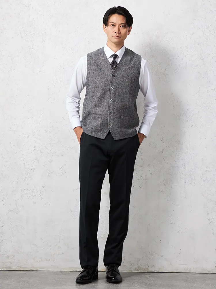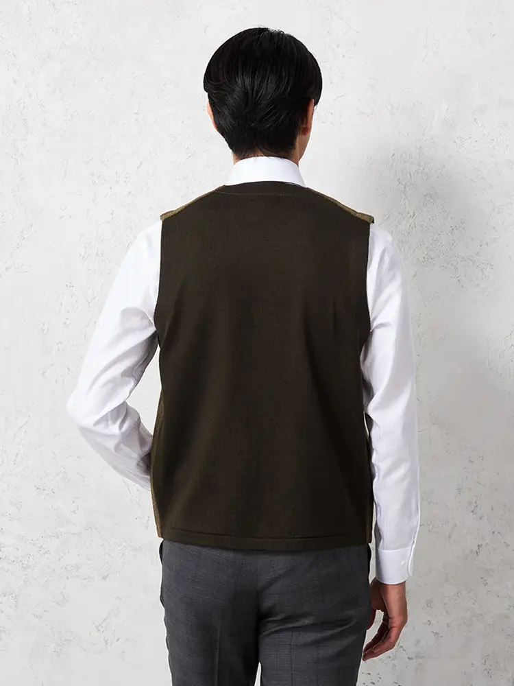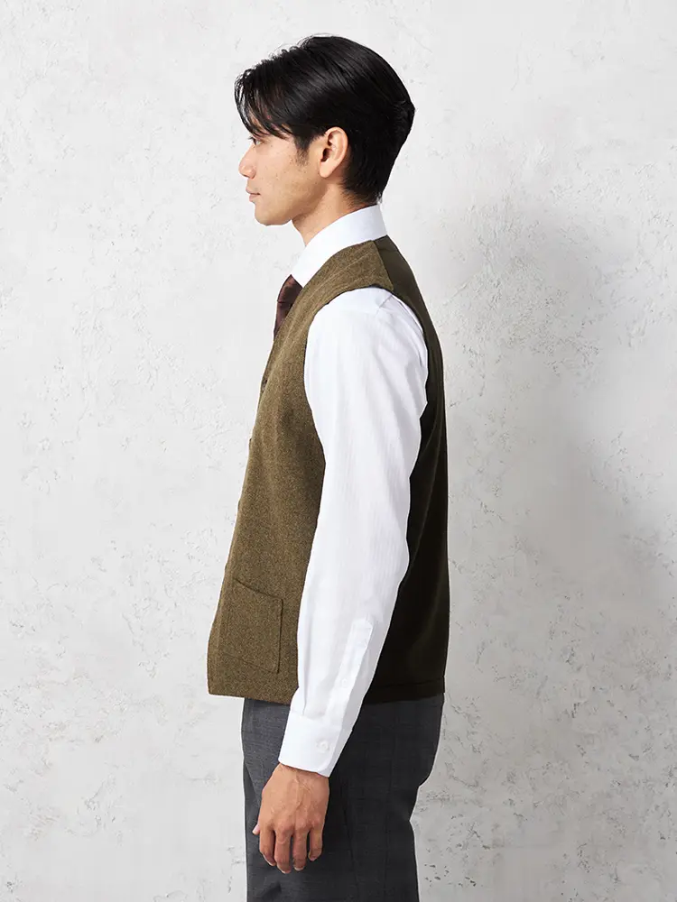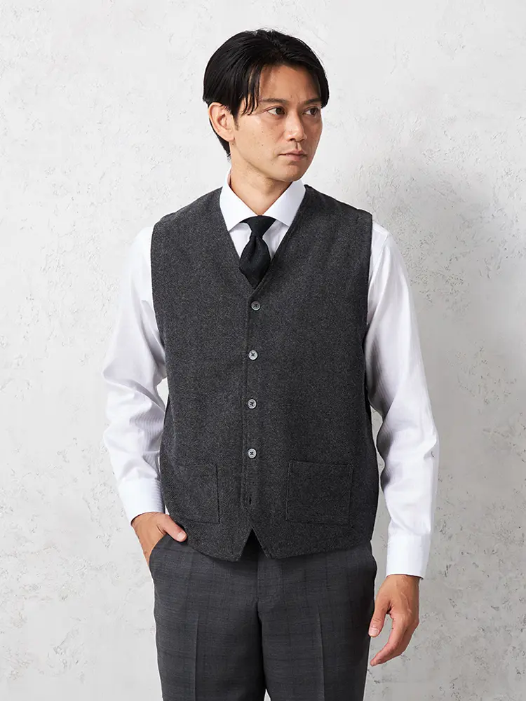 着こなしをエレガントに引き締めるウール混素材のシンプルでクラシカルなベストです。