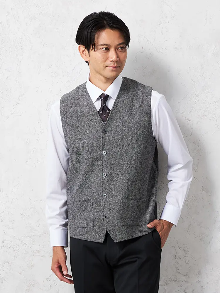 【リッケンバッカーブラック】 ツイード裏付きベスト カジュアルインナー 保温 秋冬(C.グレー)
