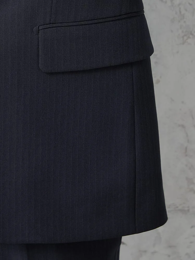 上品なネイビー×シャープさのあるストライプのスーツ
