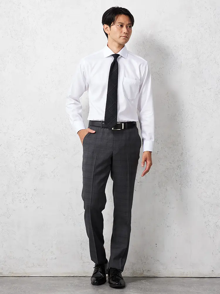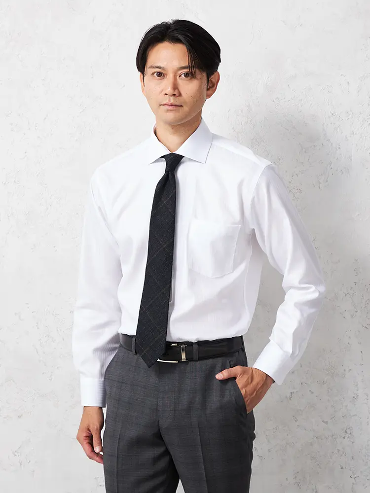 タイドアップもノータイも美しく決まるモダンなセミワイドカラー仕様。