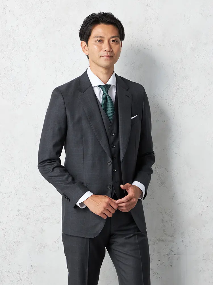 背抜き仕様のスリーピーススーツには、イタリアの老舗生地メーカーREDAの生地を使用しています。