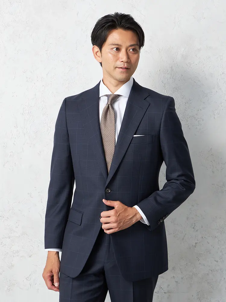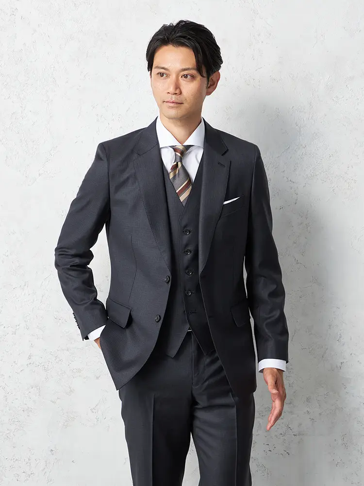 細かなチェック柄がさりげなくデザインされたセンターベントのノータックスリーピーススーツ。