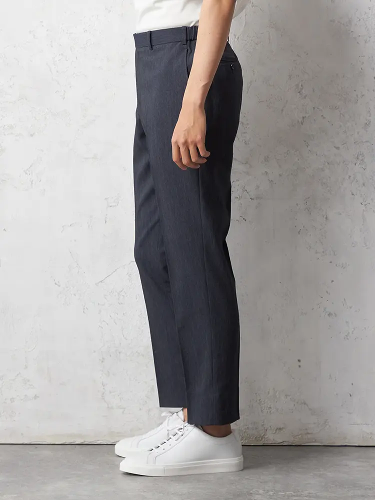 スッキリしたスリムテーパードに、脇ゴム入りのウエストで快適な穿き心地を実現。