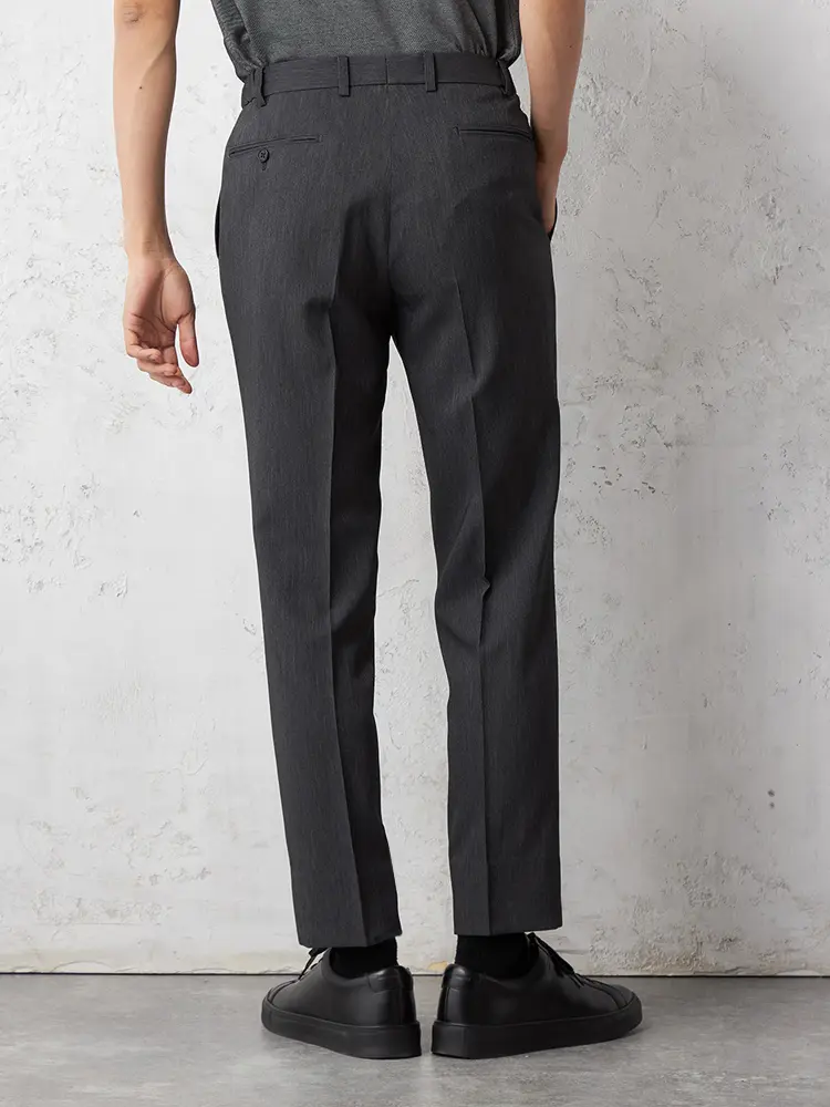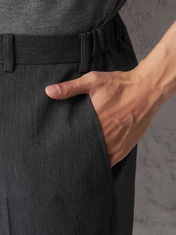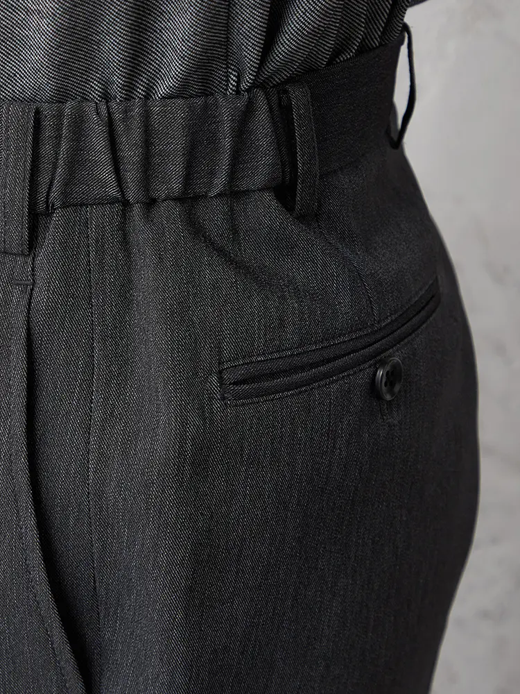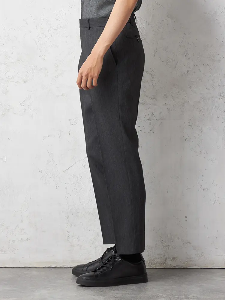 スリムテーパードの美シルエットながら、ストレッチ性に優れた合繊素材とウエストサイドの平ゴムで、