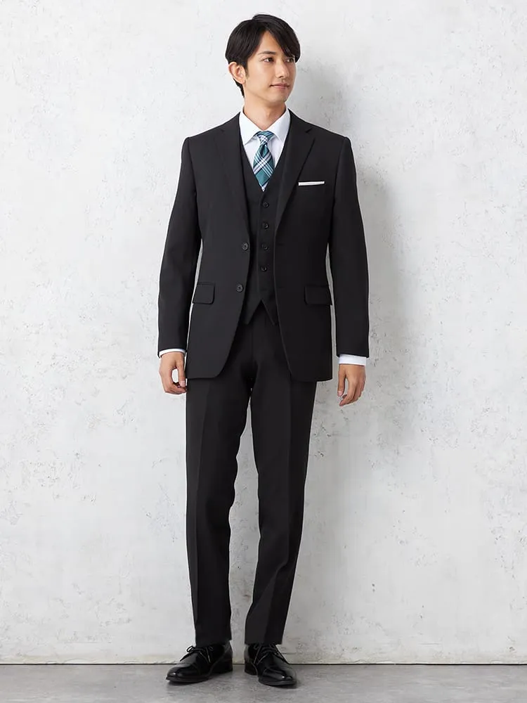 【即納】スリーピーススーツ2つボタン【WEB限定】上下ウォッシャブルブラックシャドウストライプ3シーズン対応